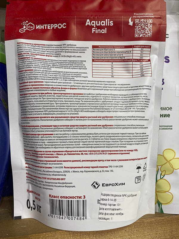 - Микроэлементы: B 0.02%; Cu 0,005%; Mn 0,005%; Zn 0,01%; Fe 0,07%; Mo 0,004%